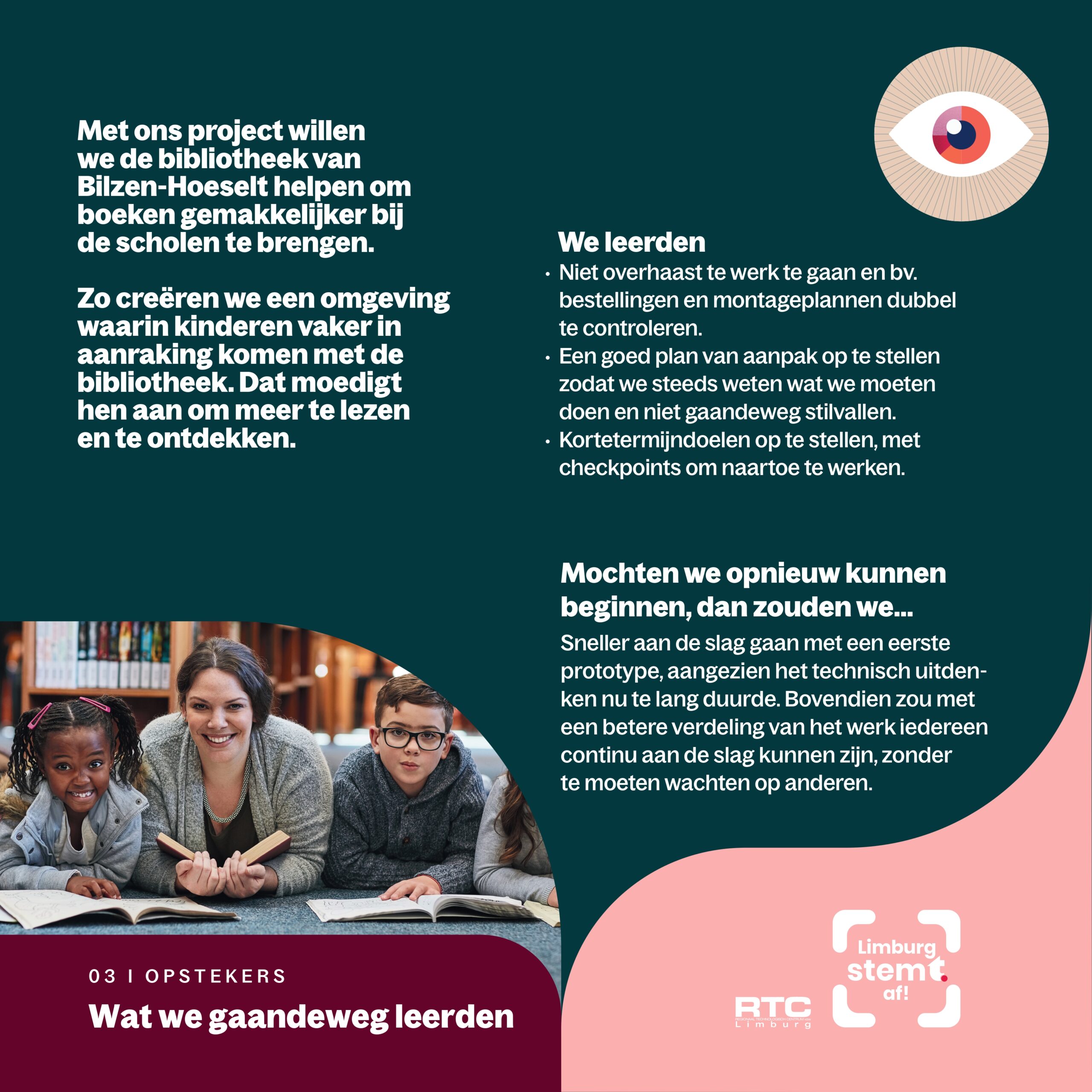 De huidige pop-upbibliotheek in Bilzen is populair, maar door slijtage aan vervanging toe. Daarom wordt er, samen met kunstenaar Jesse Biesmans en de lokale bibliotheek, gewerkt aan drie nieuwe mobiele bibliotheken. Ze zijn gebruiks- en onderhoudsvriendelijk, duurzaam én aantrekkelijk voor de leerlingen. Naast boeken zullen ze ook tablets, computers en andere materialen bevatten.